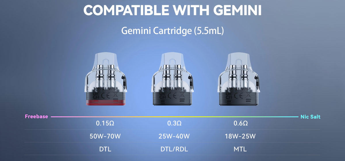 The Pod Cartridges use Twin-Core Dual Mesh Coils & come in 3 Options; .15 Ohms, .3 Ohms, & .6 Ohms. The .15 Ohm Pod Coil runs from 50W to 70W & allows DTL Vaping. The .3 Ohm Pod Coil runs from 25W to 40W & allows DTL or RDL Vaping. The .6 Ohm Pod Coil runs from 18W to 25W & allows MTL Vaping. These hold 5.5mL of eJuice and have a clear window.
