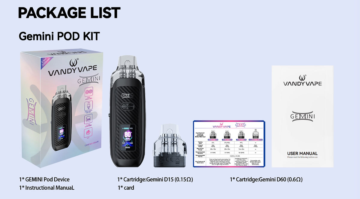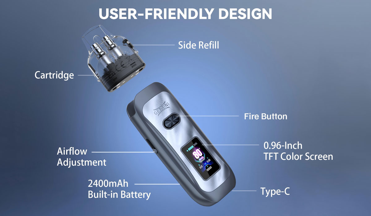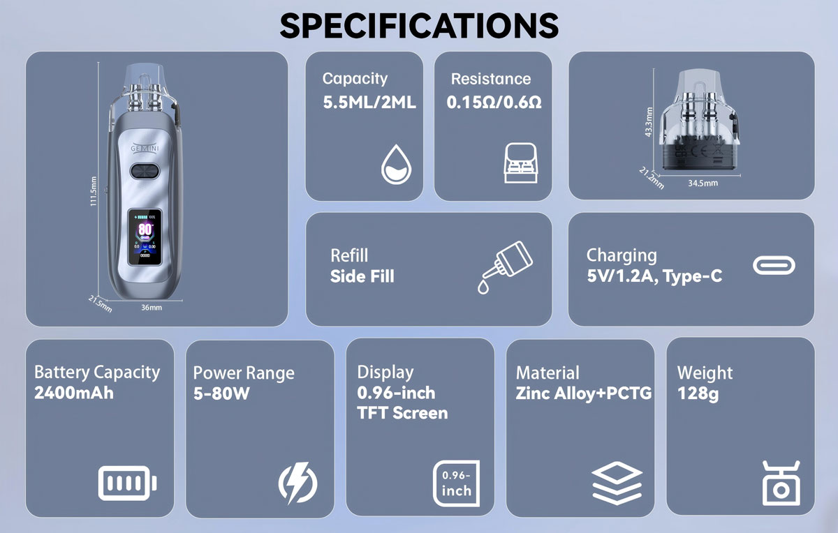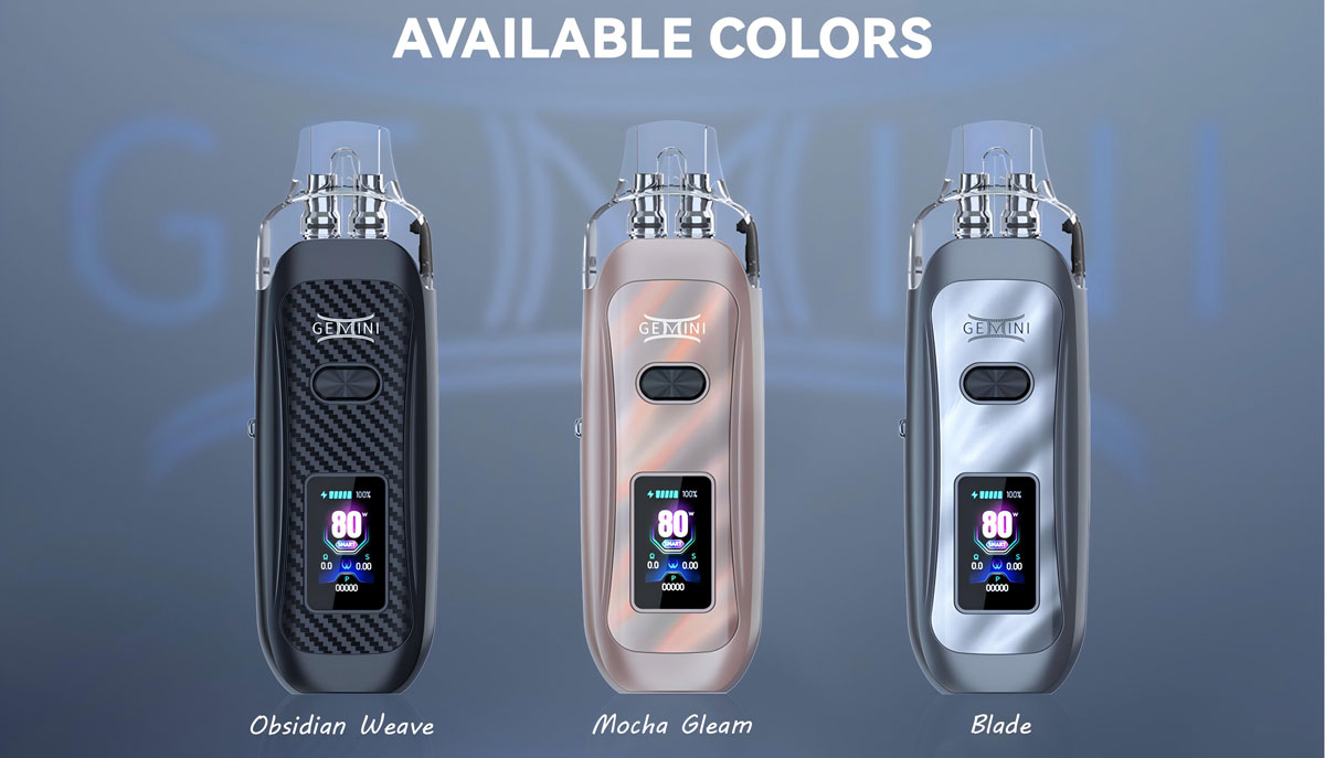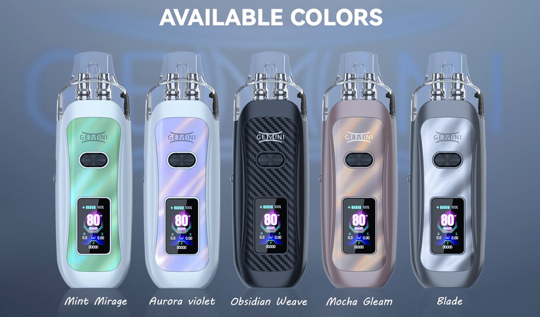 This Gemini Pod Device is gorgeous. It comes with a long lasting 2400mAh Battery. The Wattage Range is 5W to 80W. The Pod Cartridge Capacity is huge holding 5.5mL of Juice. It’s made of strong material; Zinc Alloy & PCTG. The Kit comes in at 36mm x 21.5mm x 111.5mm. It’s very lightweight, only weighing 128g or 4.52oz. It has a beautiful .96″ TT Color Screen with Dynamic High Tech Animations. You can charge this using the USB Type-C Cable that comes with it. This comes in 5 Colors; Aurora Violet, Blade, Mint Mirage, Mocha Gleam, & Obsidian Weave.